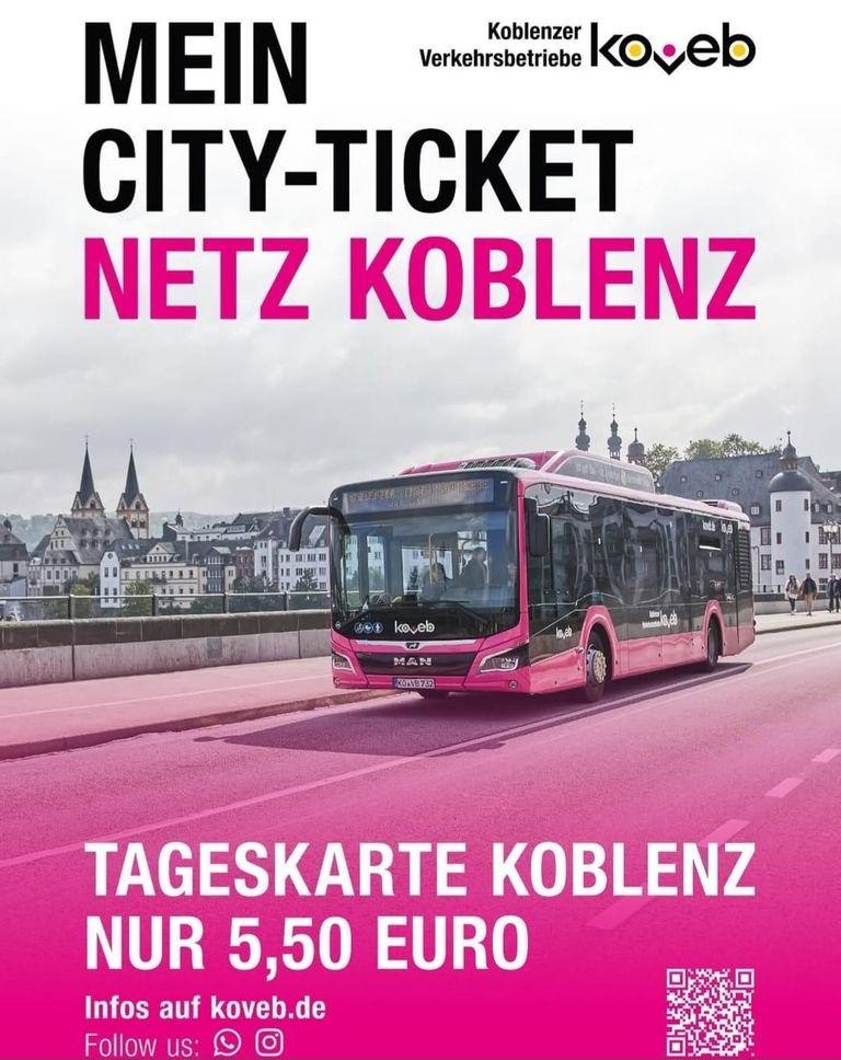 Die Rückfahrt kann mit den Bussen der Koveb ab Sporthalle Oberwerth mit der Linie 3/13 über HBf bis in die Innenstadt (Zentralplatz, Löhr Center) erfolgen. Der Linienbus fährt im halbstündigen Takt. Fahrpreis: 4,10€ /Erwachsener. Minigruppenkarte 9,90€ für bis zu 5 Personen. Tageskarte Netz Koblenz 5,50€ p.P..